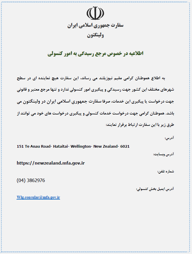 اطلاعیه سفارت جمهوری اسلامی ایران در ولینگتون در خصوص مرجع معتبر رسیدگی به امور کنسولی